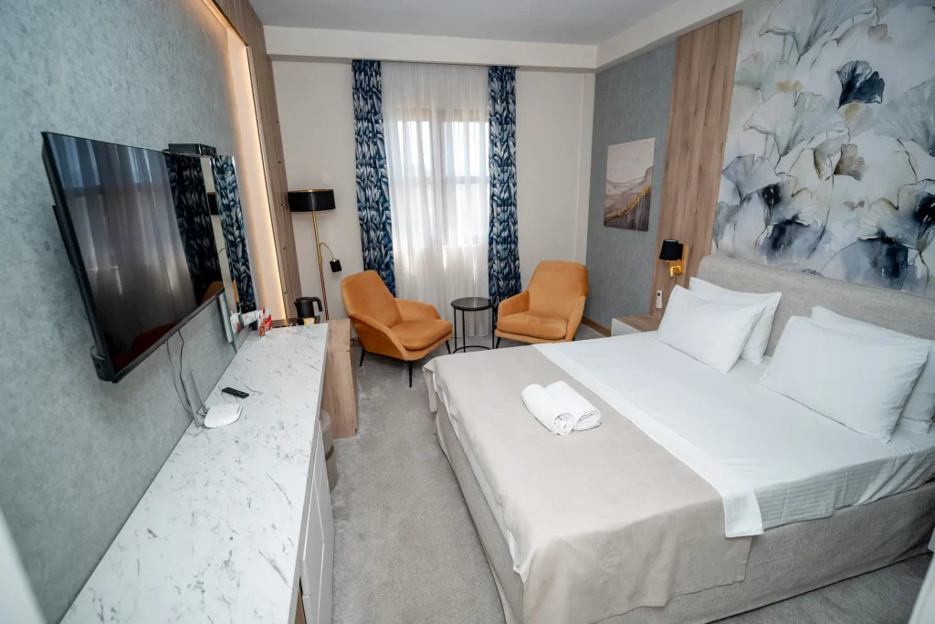 Uživajte u luksuzu i komforu u našem moderno opremljenom apartmanu površine 113 m². Ova privatna smeštajna jedinica namijenjena je za boravak do 4 osobe i sadrži: prostranu spavaću sobu, moderno kupatilo, pametni sistem upravljanja (rasvjeta, klima, muzika), Wi-Fi internet, sef, minibar i klimatizaciju. Opustite se na privatnoj terasi sa prelijepim pogledom na vrt i uživajte u savremenom ambijentu dizajniranom za vaš potpuni komfor.