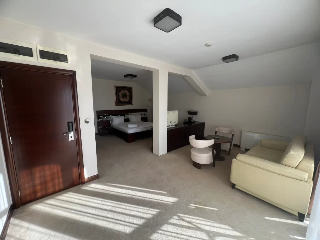 Prostran i udoban Junior Suite apartman površine 36 m² idealan je za porodicu ili grupu prijatelja. Raspolaže sa jednim king-size krevetom i tri single (twin) kreveta, moderno opremljenim kupatilom, minibarom, klima uređajem, flat-screen TV-om i besplatnim Wi-Fi internetom. Uživajte u mirnom pogledu na vrt i prijatnoj atmosferi koja spaja udobnost i stil.